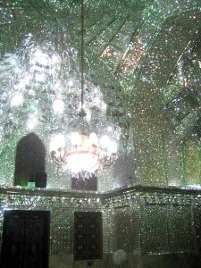 The most memorable mosque in Shiraz was the highly ornate Imamzadeh-ye Ali Ebn-e Hamze, containing the tomb of Emir Ali, nephew of Shah Cheragh, built in the 19th century. We were required to don the chador again, but I got a floral print this time, not merely as much fun as the solid black one. The shrine was covered in every square inch with mirrored mosaics of every shape and design, none of them much over an inch in size. It glittered like diamonds from the floor to the top of the dome.