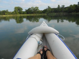 I had failed to tighten the cap on one of my pontoons, so I pulled over along the shore to add some air and cool off for a refreshing morning swim. It was here that Bill, the ex-Marine helicopter pilot, GI Joe / Ken Doll, also known as my “angel in a muscle suit” paddled over in his sleek yellow kayak to see if I needed some help. We shared a couple of laps around the lake, ergo my third “gift” for the weekend! 😉