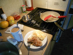 My family came out to join me on Sunday, bringing steaks, brats, and baked potatoes for an impromptu cookout. It was their first look at the “new” motorhome. Nothing like hosting six people to help draft a shopping list of “necessary items” real quick!
