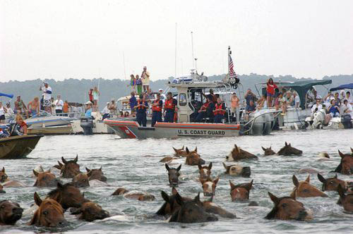 These mares have been the casualties observed in years past. And their foals, easily confused by the unexpected swim, are also likely to become disoriented and attempt to swim back. Boats that accompany the swimmers have had to rescue mares, presumably by injecting them with calcium mid-swim. Confused foals have been hoisted from the water to board the boats.”