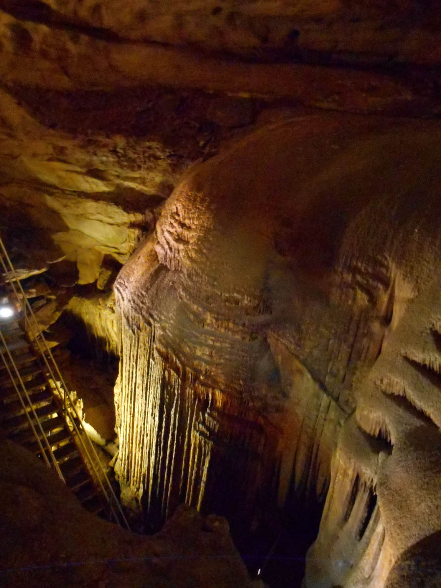 There are 26 entrances to the Mammoth Cave system, only seven of which are natural, the remaining being man-made. This “new” entrance was not opened up until 1921, during the Kentucky Cave Wars, when land owners blasted and drilled in hopes of sharing the wealth of the tourist dollar. We entered through the “New Entrance,” and exited out the “Frozen Niagara” entrance, passing through three major geographical changes, the first being high domes and bottomless pits, the middle being a broad, low-ceiling, dry passage with massive boulders, and the third being the most decorated section of the cave system, “Frozen Niagara.” This was the only “electrically lighted tour” I took.