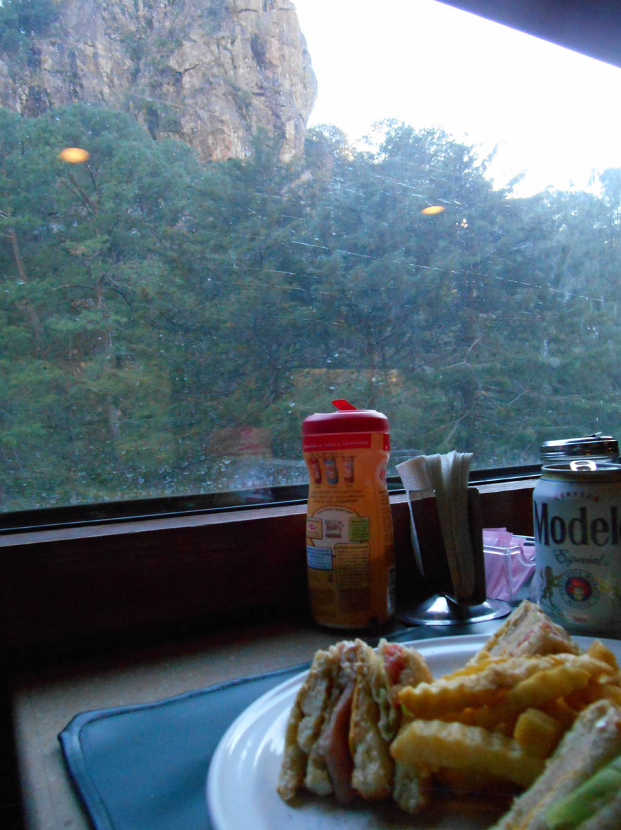 The stop in Divisidero was also an opportunity to sample lots of local offerings, such as the blue corn tortillas stuffed with pork and covered with green chili sauce and queso fresco like my seat-mate devoured in front of me, once back on the train.  But 15 minutes to walk to the canyon overlook, check out the indigenous people, and eat Gorditas is about three days and 45 minutes too short.   Having spent my 15 minutes at the canyon rim, I had to resort again to the dining car for continued views.