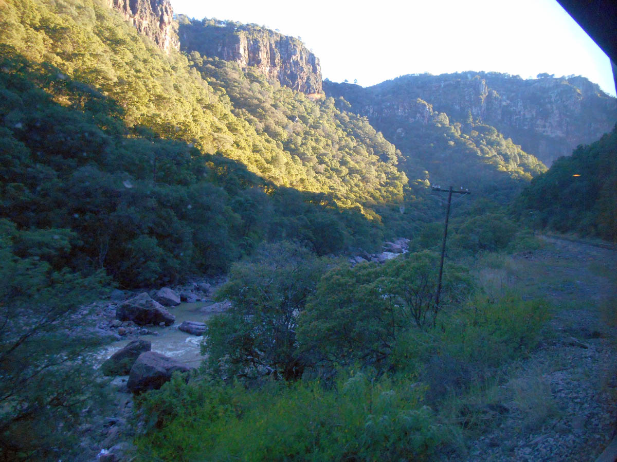 By now, the sun was starting to sink low, casting long shadows through the gorge, so all but the die-hard photographers had retired to their seats.   I decided to walk the length of the train, and discovered that the very back car was completely empty, except for two armed guards carrying machine guns, dressed in all black “federale” clothing.   I swallowed hard as I considered the implications of this – it was a toss-up over whether I was concerned to be on a train that needed armed guards, or relieved they were there for our safety.  They allowed me to “passe” on down the aisle, where I stood for at least an hour, watching the scenery unfold and the rails roll out from under the train from the back window.