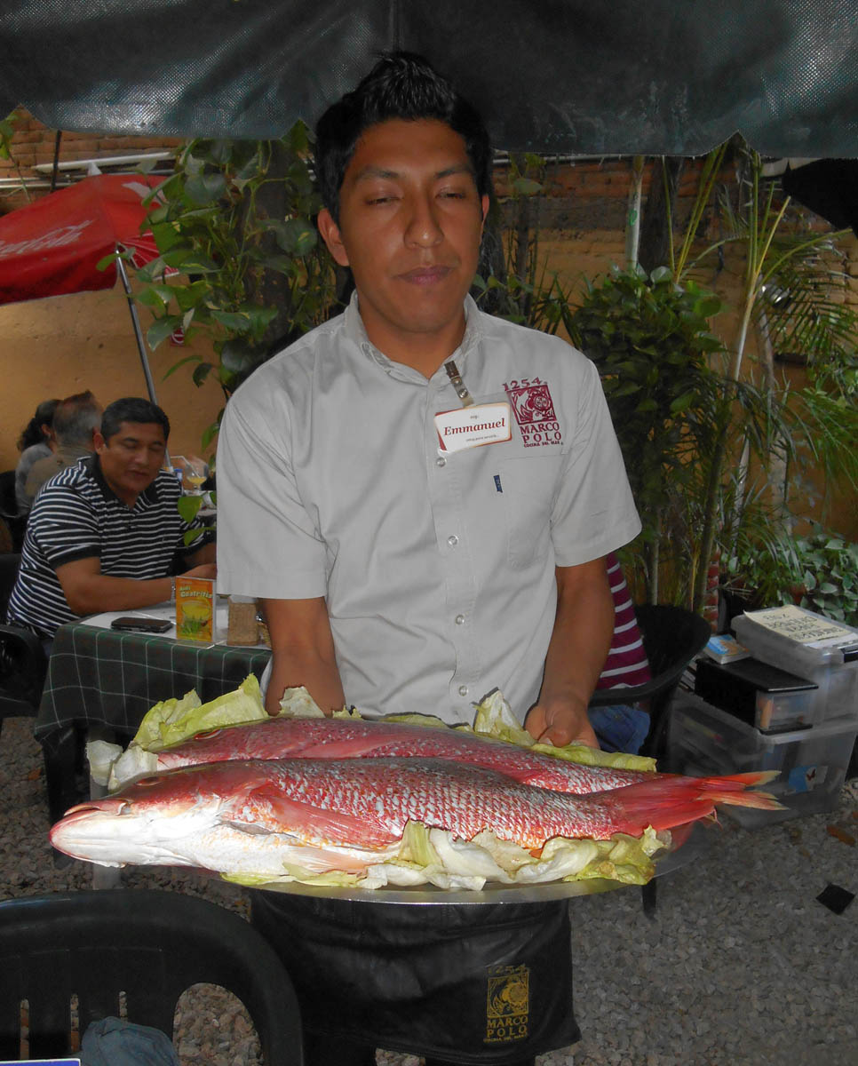 The best exception to the scaled back holiday offerings was Marco Polo, a small outdoor restaurant specializing in seafood. They had fresh red snapper on the menu by the kilo, so Don asked the waiter, “What is your smallest red snapper you have?” Out comes a plate of two “beeeeeeeg fish!” for us to choose from! We decide to split the smallest one, about 4.5 pounds, asking that it be scored and fried. The crust came out crispy golden brown on the outside, and the fish flesh was sweet and succulent, the best we agreed we had ever tasted!