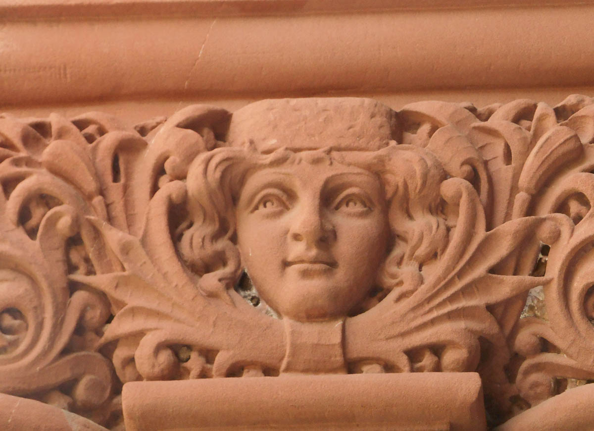 Legend has it that the stone mason, Harry Herley, who was contracted to carve the columns around the ground level of the courthouse rather fancied the daughter of his landlady at the local boarding house, Mabel Frame.   Infatuated with Mabel, he started out carving her likeness in the sandstone in a flattering manner.  But as Mabel rejected his affections, the likenesses grew increasingly grotesque in his attempts to mock her.   The legend of the sculptor’s scorn unfolds as one walks around the ground level of the overly ornate building.