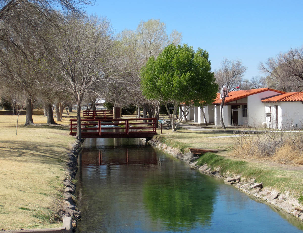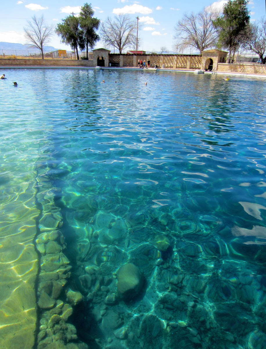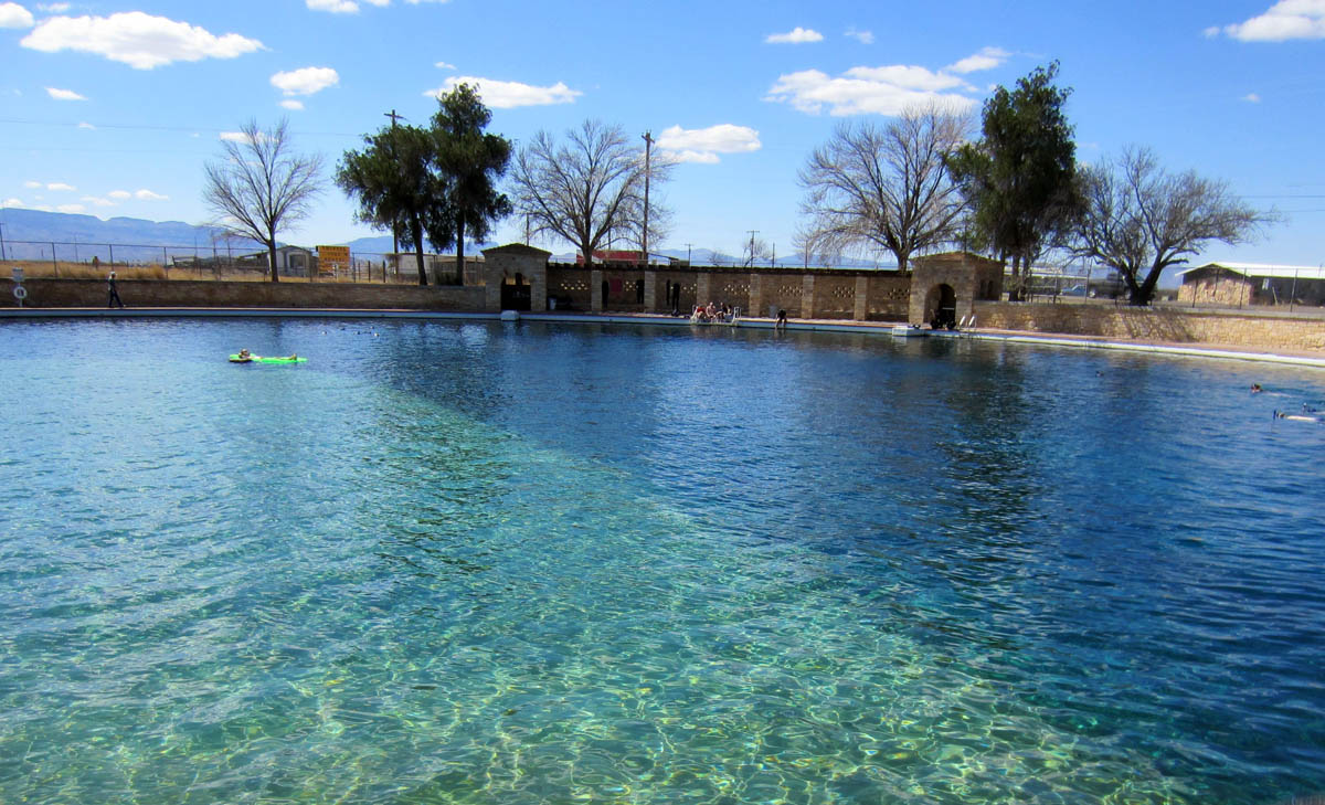 The CCC hand-built the pool, bathhouses, and adobe motel rooms using local limestone and adobe brick excavated from the pool.