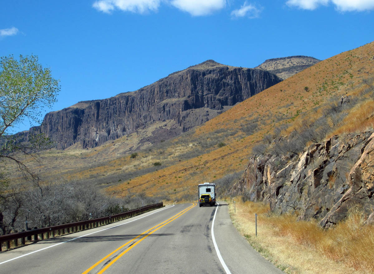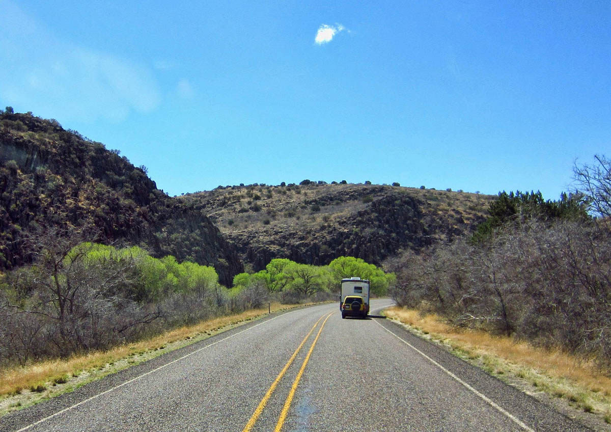 Finally the weekend arrives, and with it comes my long anticipated vacation. Having planned to make a couple of stops in between Balmorhea and Big Bend, I awake to the rock and rolling of a rip roaring wind like I have yet to experience in the Winnie. I radio Lynne to ask her if she is concerned about traveling with the wind this gusty. In a landscape as barren as Balmorhea that offers no protection, we can’t be more exposed, so we agree that we are probably better off to get going as soon as possible. We will just take it slow…