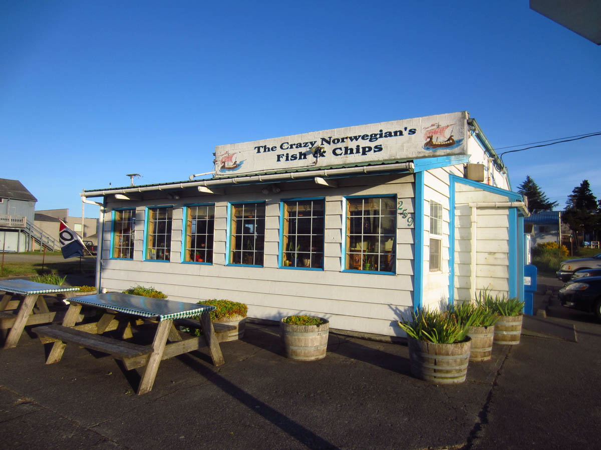 Driving up the coast, I had seen a cute little restaurant along Highway 101, “The Crazy Norwegians” advertizing Fish & Chips.   I thought it looked like a quaint little unique place, and later had that seconded by the Cape Blanco Lighthouse hosts that the Port Orford Norwegians were known for their local seafood.IMG_0488