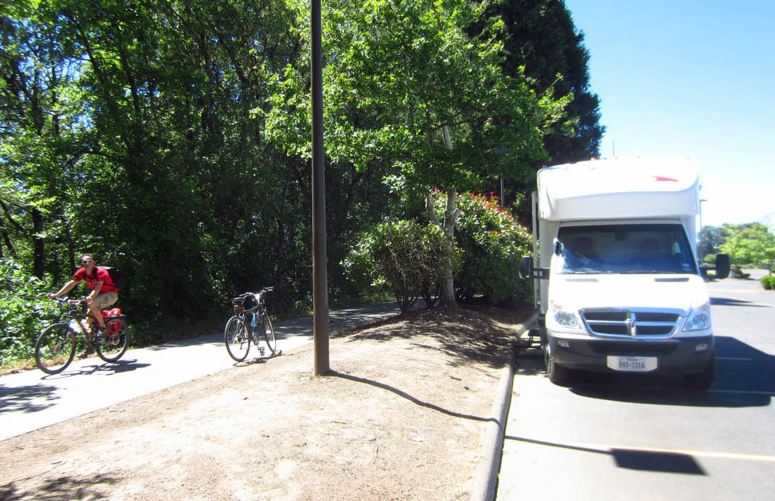 With the Regal Cinema 15 theatre within a stone’s throw, I had a back-up plan in case I got bored in a parking lot.  I figured I could fill some time with a movie and popcorn.  But truth is, there was never time!   Especially with sundown now lingering up toward 9:00pm.  Just literally out my door was a fantastic bike path, which I rode every day at lunch or after work, sometimes twice per day.    The path is paved along both sides of the Willamette River, with little side parks, duck ponds, and scenic pedestrian bridges along the way.IMG_0902 IMG_0943 IMG_0921