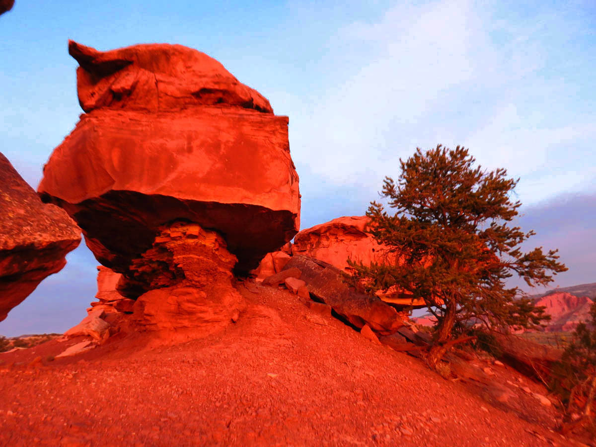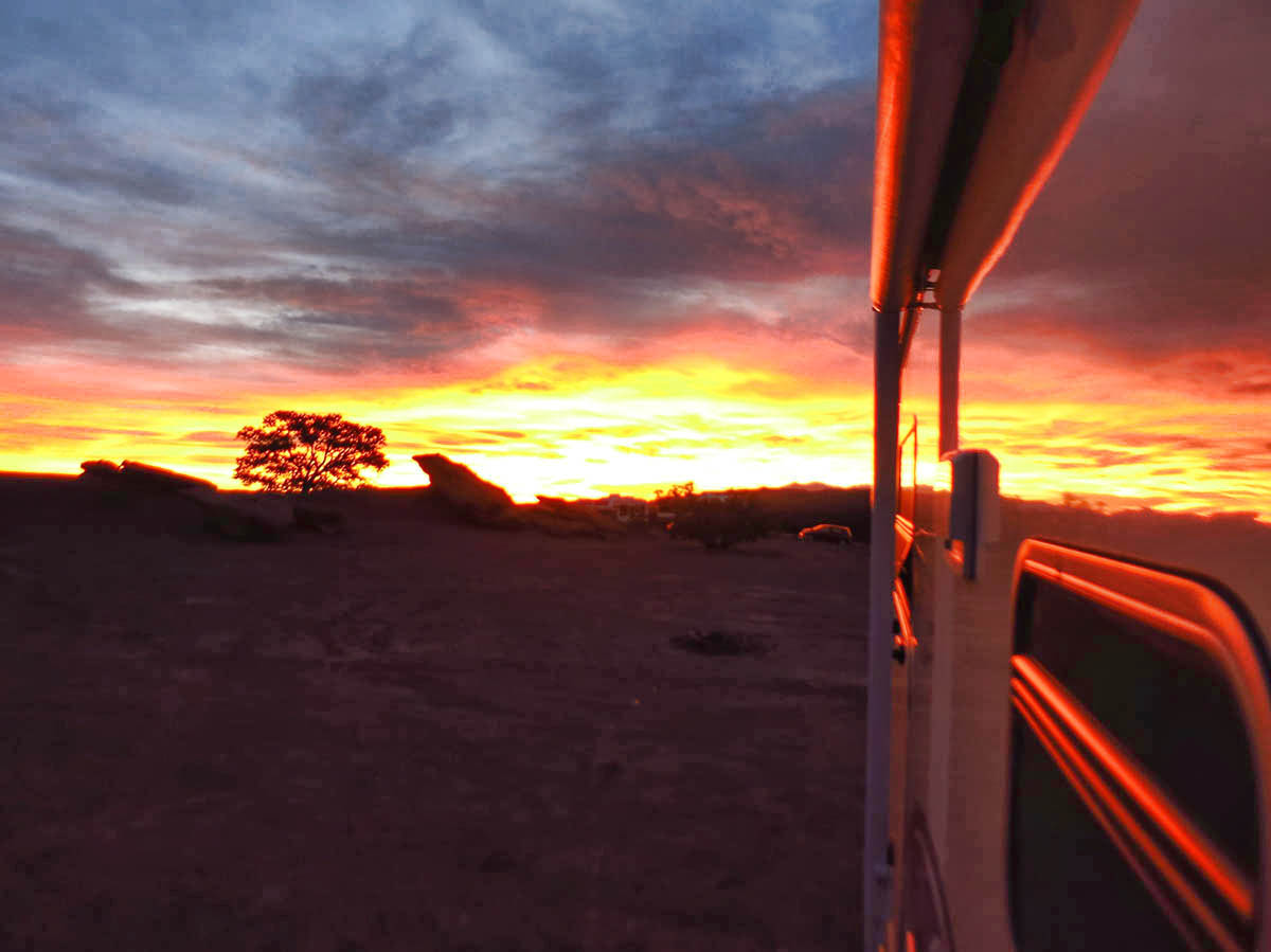 Red rock in our boondock camp set ablaze by the fire sky at sunrise