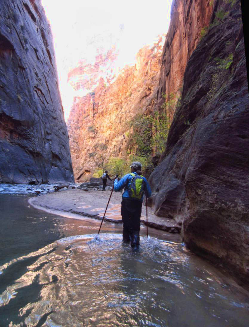 Imagine if you will the high anxiety that surrounds hiking Zion’s Narrows Canyon. It is one of the most highly sought after hikes in the park, second only to the steeper, higher Angel’s Landing. One must brave wading through a flowing, 46 degree river of varying depths, maintain balance across bowling-ball-shaped rocks, all while protecting precious cargo like cameras and vital organs.