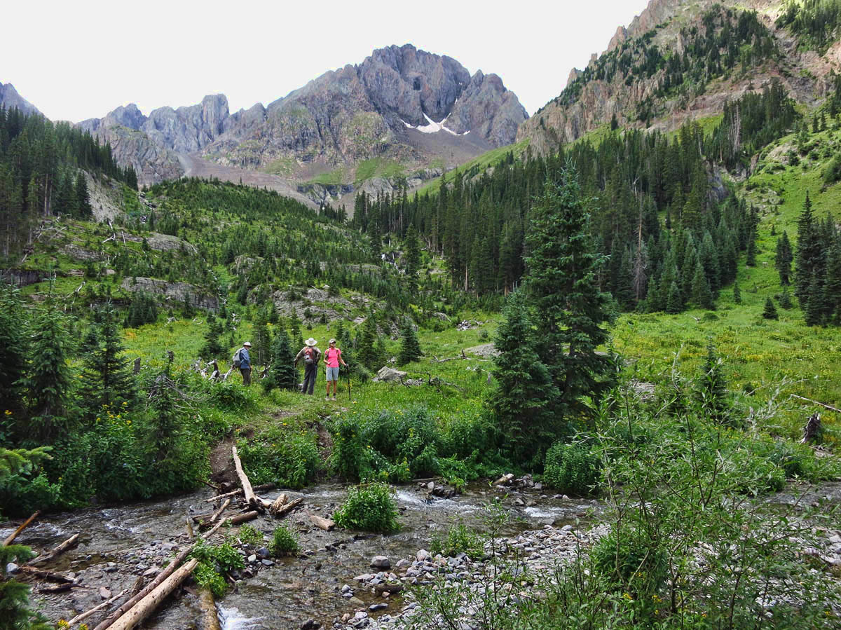 Blaine Basin trail is a beautiful, moderate 6.5 mile hike with 1,850’ elevation gain. The trail starts out through dense forest alongside a musical brook, crosses Wilson Creek three times, and ends up in a gorgeous wildflower-filled basin beneath the face of Mt. Sneffels. That’s about all I can tell you.