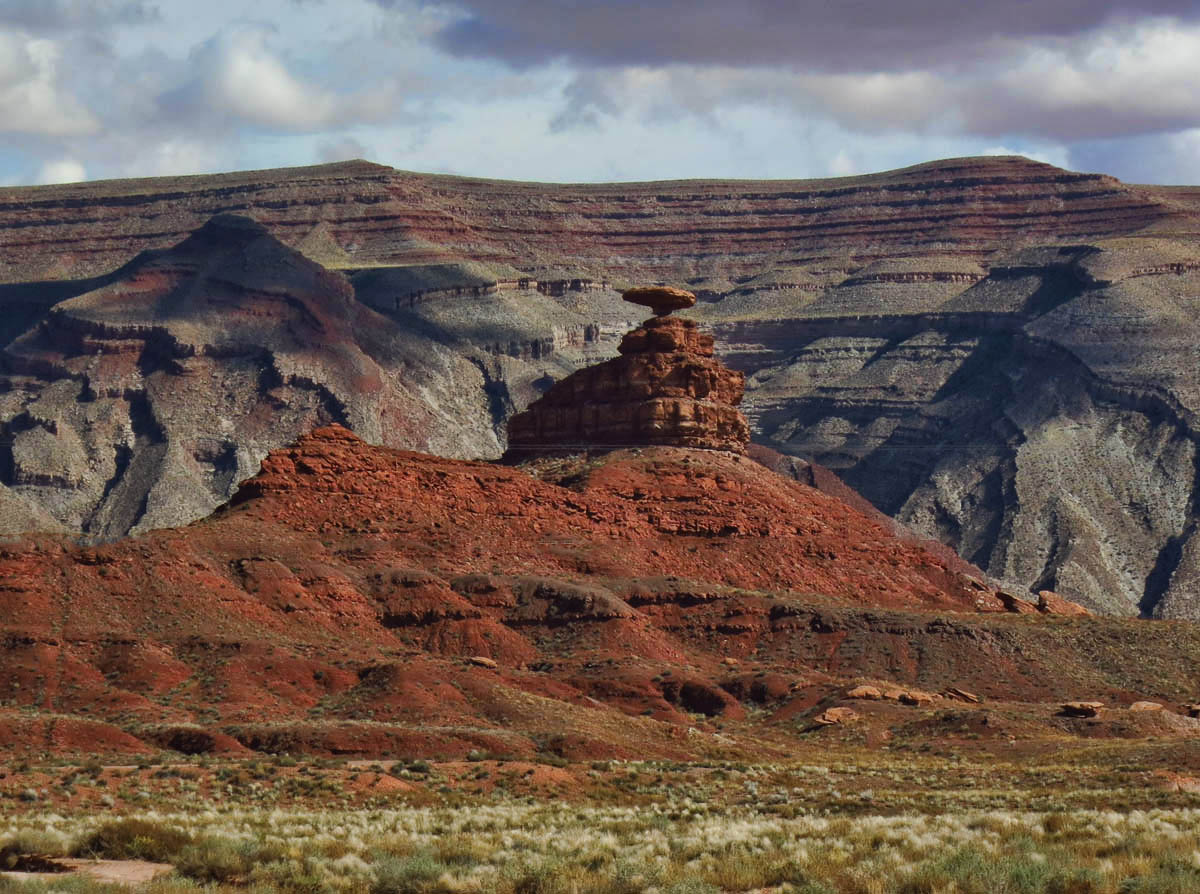 Rock formation on very top resembles upside down sombrero near the town of “Mexican Hat.”