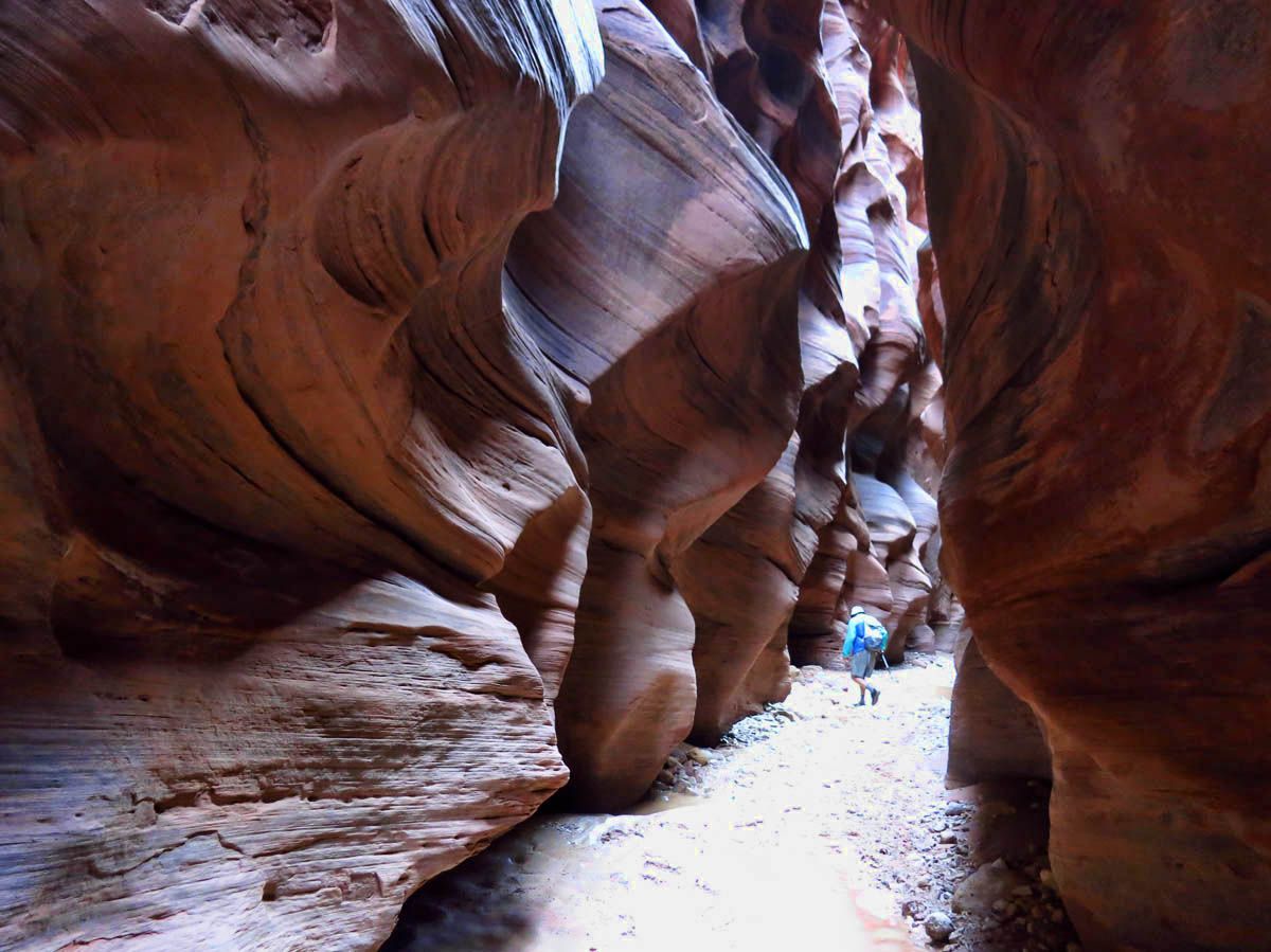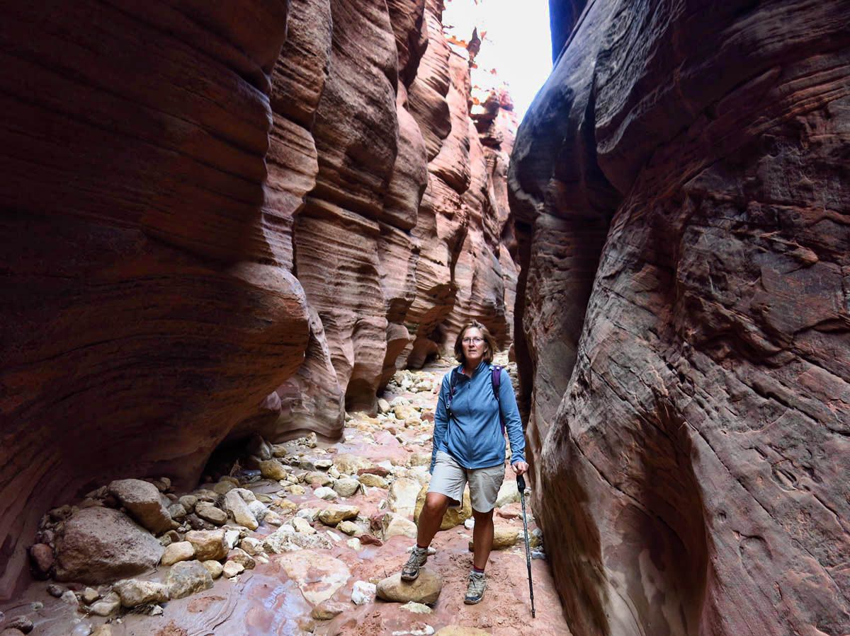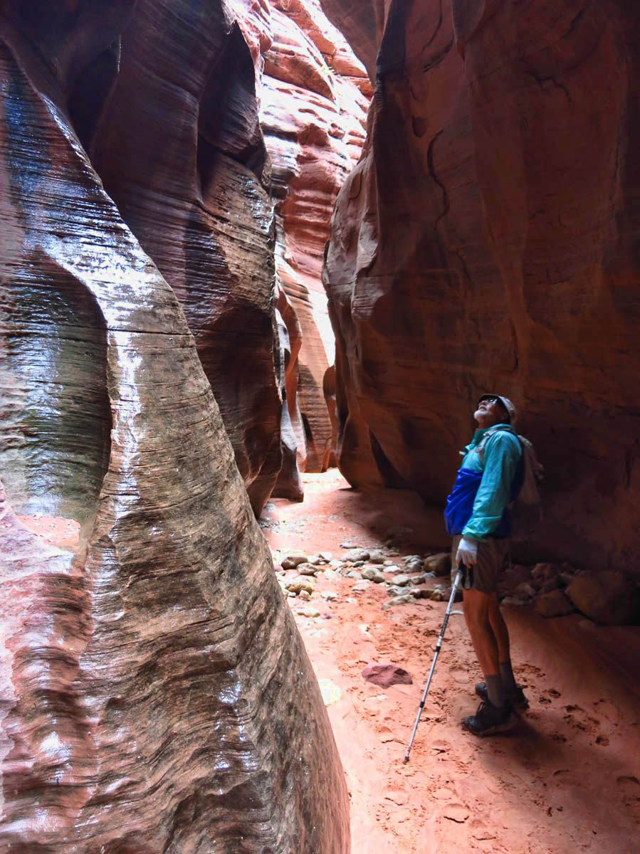 • Hi, Karen — I didn’t do the entire length of the canyon. Buckskin Gulch is 20 miles in total, so you either have to climb out of the canyon mid way and camp, or “flash” it in one day. There are a lot of bowling ball sized boulders along the path, so I can’t imagine making the entire length in one day! That’s almost a marathon! (And even though the distances are longer and the hikes a little more challenging, I am STILL the “follow along gal.” haha!)