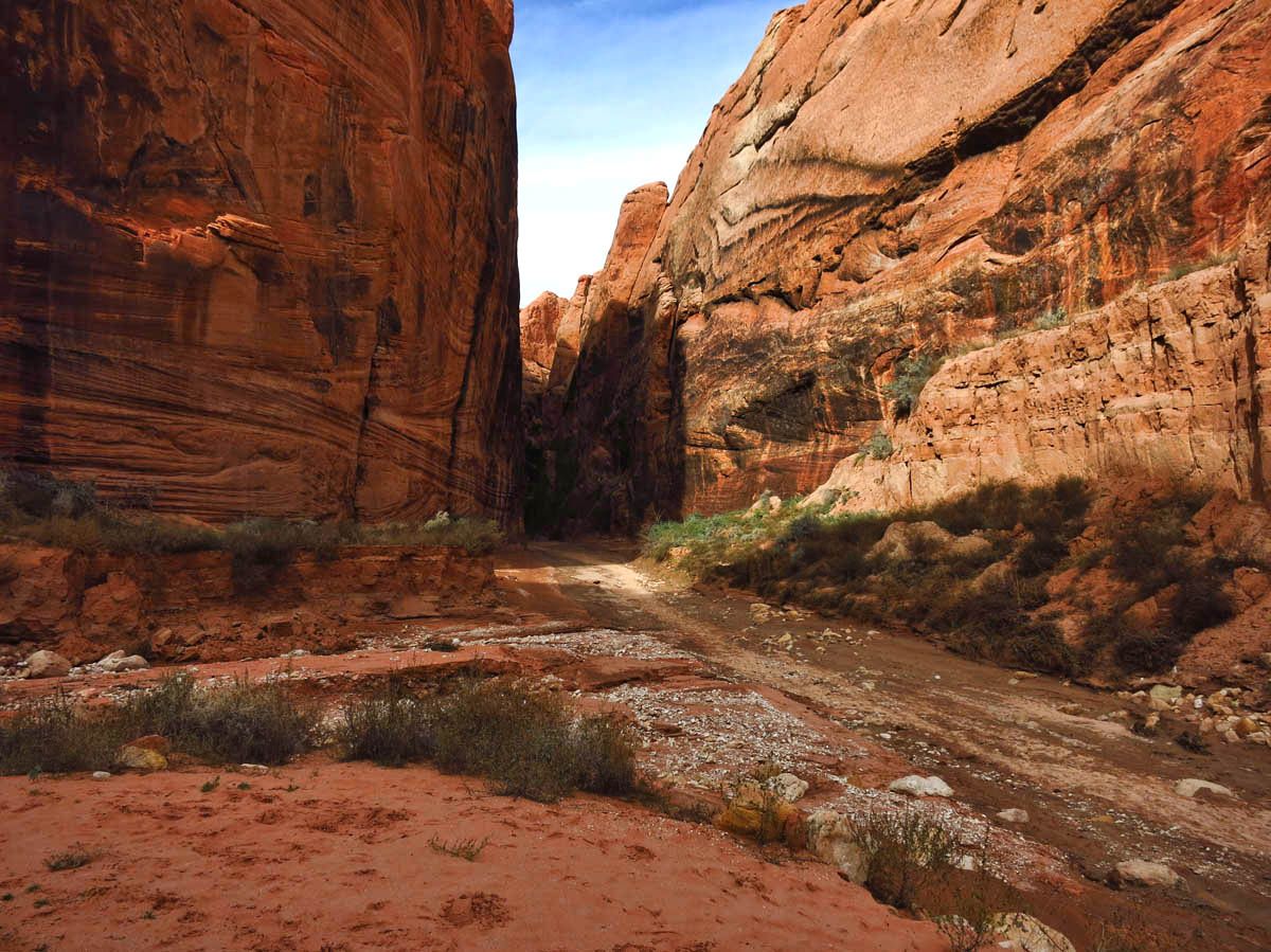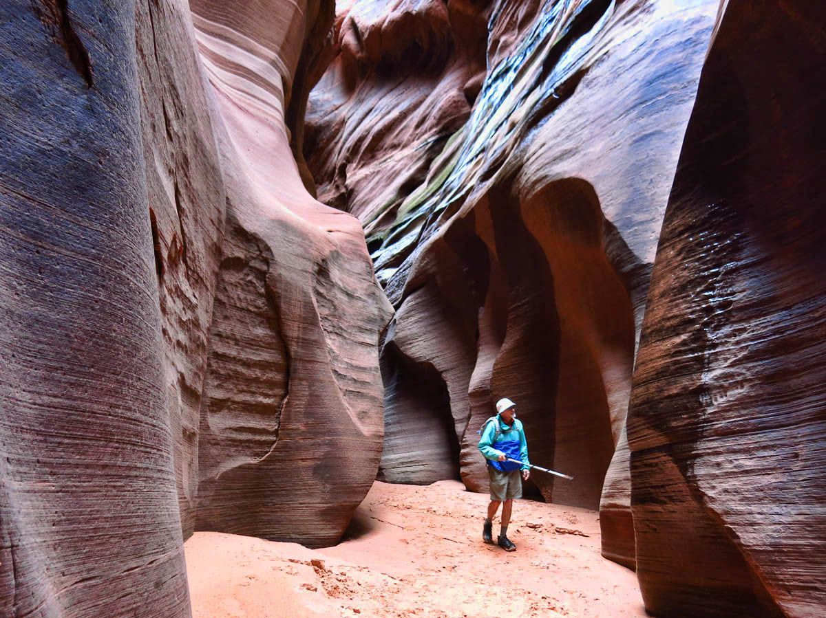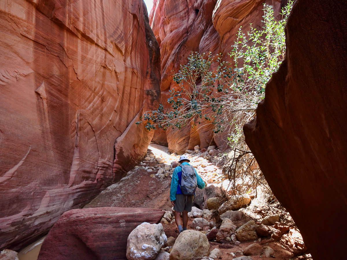 • Hi, Karen — I didn’t do the entire length of the canyon. Buckskin Gulch is 20 miles in total, so you either have to climb out of the canyon mid way and camp, or “flash” it in one day. There are a lot of bowling ball sized boulders along the path, so I can’t imagine making the entire length in one day! That’s almost a marathon! (And even though the distances are longer and the hikes a little more challenging, I am STILL the “follow along gal.” haha!)