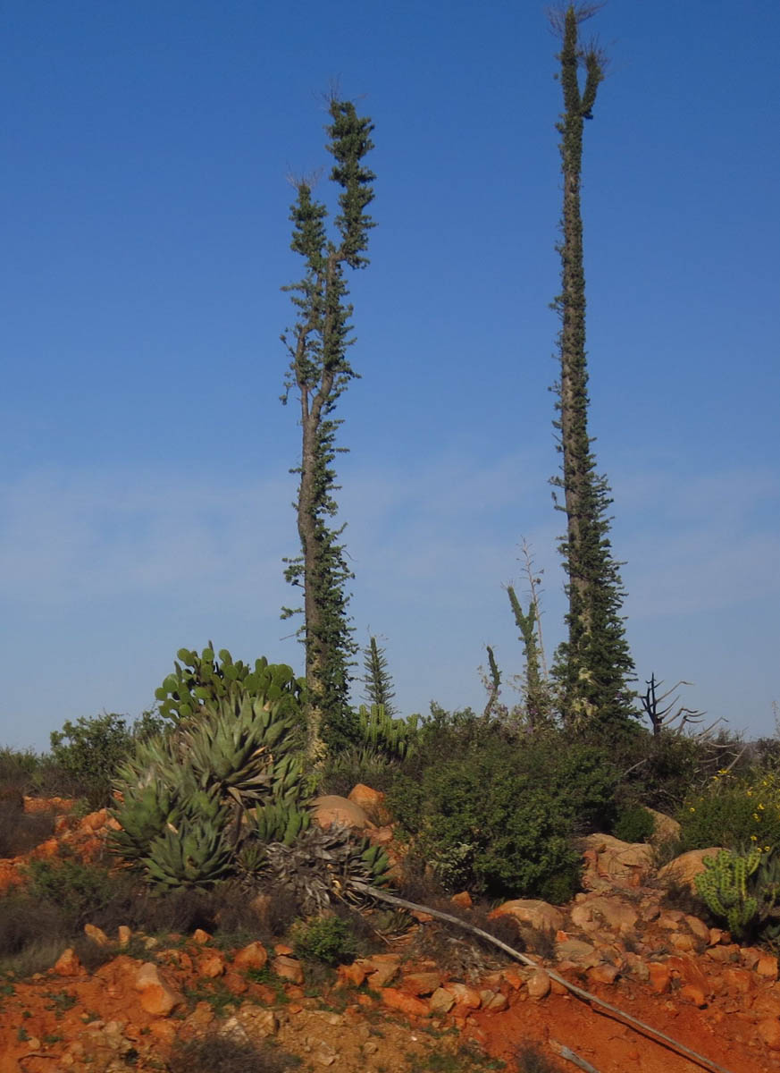 This protected section encompasses one third of the Baja Peninsula. The area is best known and gets its name for the “Boojum” tree, or Fouquieria columnaris, which is mostly endemic to this area. This is a silly looking tree which my guidebook best describes as “Dr. Seuss trees.” They look like upside down carrots – long, skinny tapers with tufts at the end, ergo the name “candles.” Some of them are downright whimsical, as the top section of the “candle” twists and curls. Unfortunately, their narrow, delicate shapes are difficult to capture from a moving bus window.