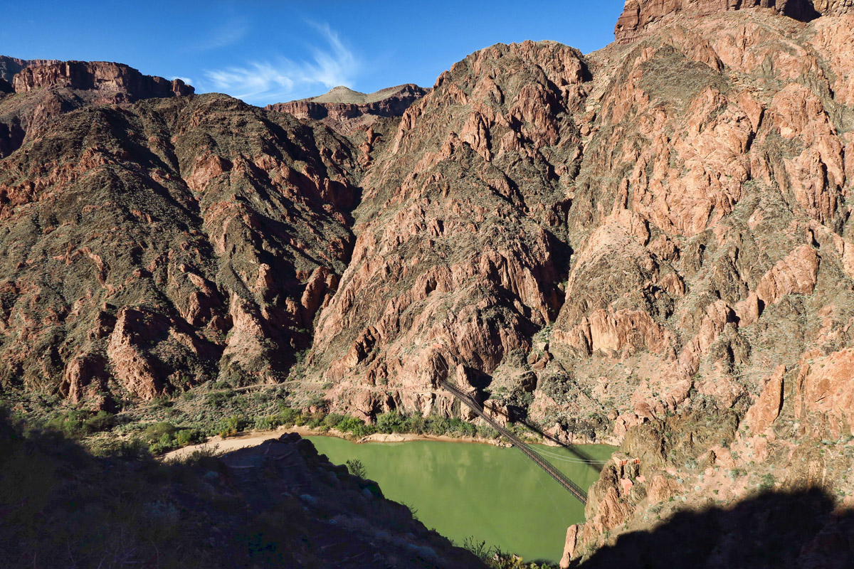 That tiny black “thread” across the river is the suspension bridge known as the “Black Bridge,” not to be confused with the “Silver Bridge” on the Bright Angel trail.
