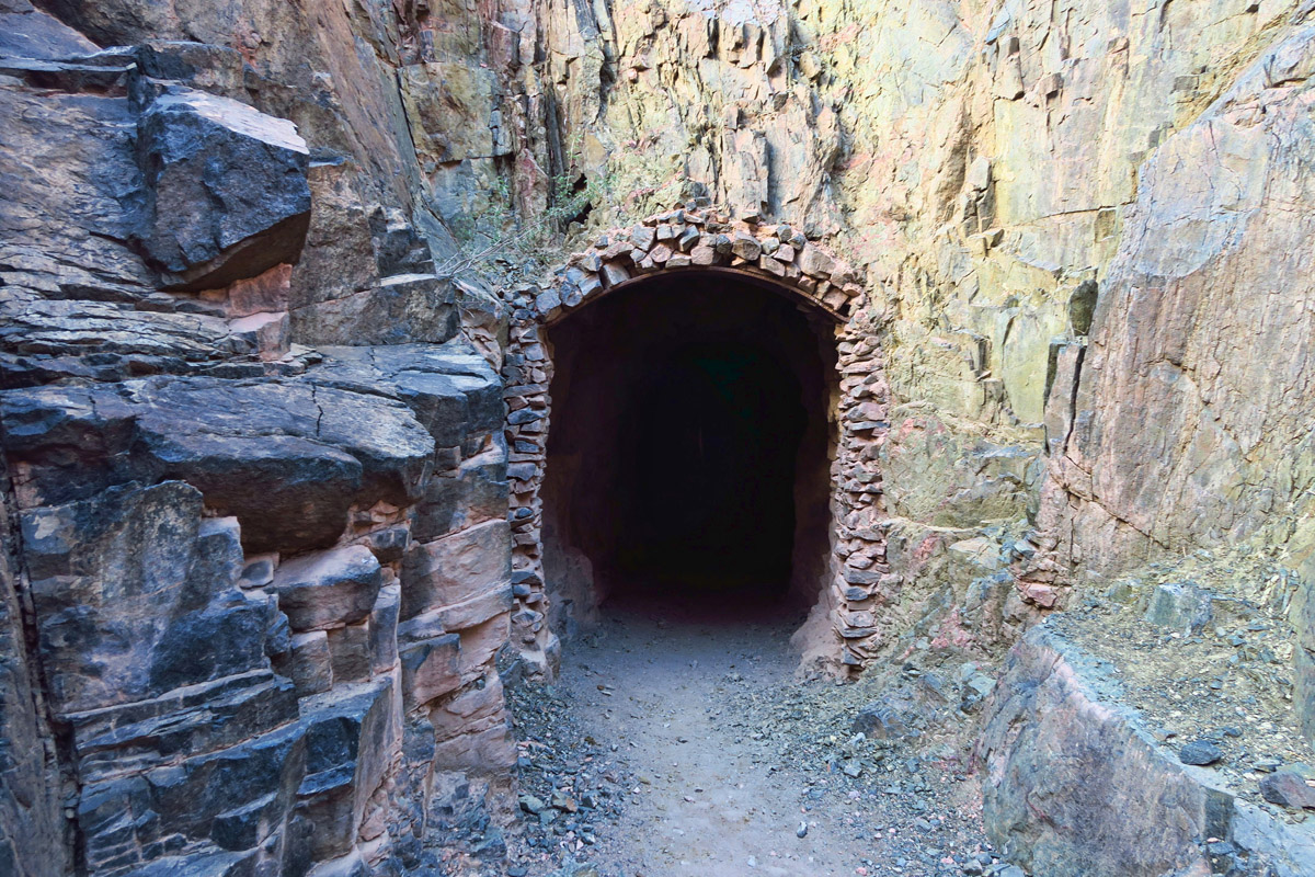 Still, reaching the river…the bottom of the canyon, and raison d’être for this massive geological cathedral that surrounds me, is emotionally overwhelming. I can hear it as soon as I see it, dodging shallow rocks while swirling around deep eddies. Once I finally reach the “black bridge,” accessed by a tunnel blasted in the rock, I am verklempt. An informational sign at the base tells about the bridge, built in 1928 to replace a cable car with a one-mule cage. “Much of the work was accomplished at night under floodlights in attempt to escape the summer heat. The eight main cables, each 550 ft, could not be loaded on mules. They were carried down on the shoulders of men.”