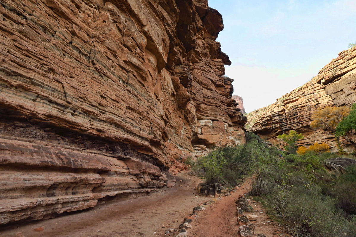 I did not anticipate the Bright Angel Trail to be so scenic.  I’d read that it was a maintained dirt trail up a side canyon, used as the primary mule route, “graded for stock.”  So I expected muddy switchbacks and a more limited views and sparse vegetation.  But hiking up through the Bright Angel Fault alongside a creek proves to be beautiful, and such a different scene than the South Kaibab trail.  There are golden cottonwoods along the babbling brook, so seeing water and lush vegetation in tight, pancake-rock canyons is an inverted view to the wide open scenes from the South Kaibab ridgeline trail.