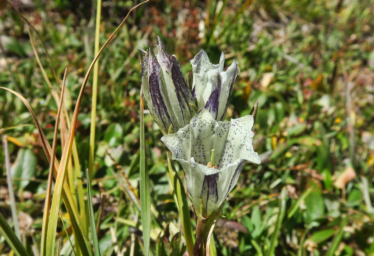 “The elegant blossoms of arctic gentian scattered throughout the meadow turf community signal the end of the brief alpine summer. This gentian is one of the last plants to bloom on the tundra, and as its name implies, it is also found throughout the Arctic. The purplish flower buds unfold into a vase-shaped white cup streaked and dotted with purple.”