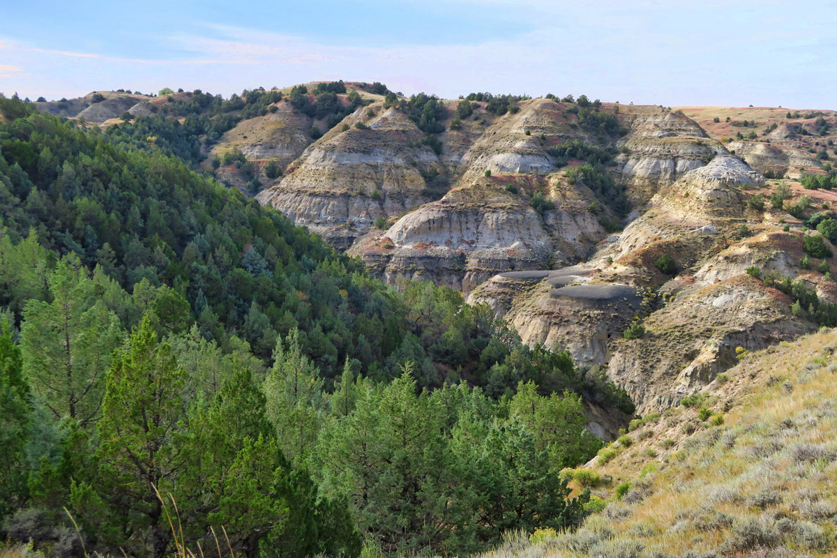 Whereas the South Unit is more rolling badlands and mounds of striated sandstone, the North Unit has more of a “canyon” feel to it…as if South Dakota’s Badlands and the Grand Canyon hooked up and sprouted an offspring. Vast overlooks, deep gullies, and bison traffic jams galore.