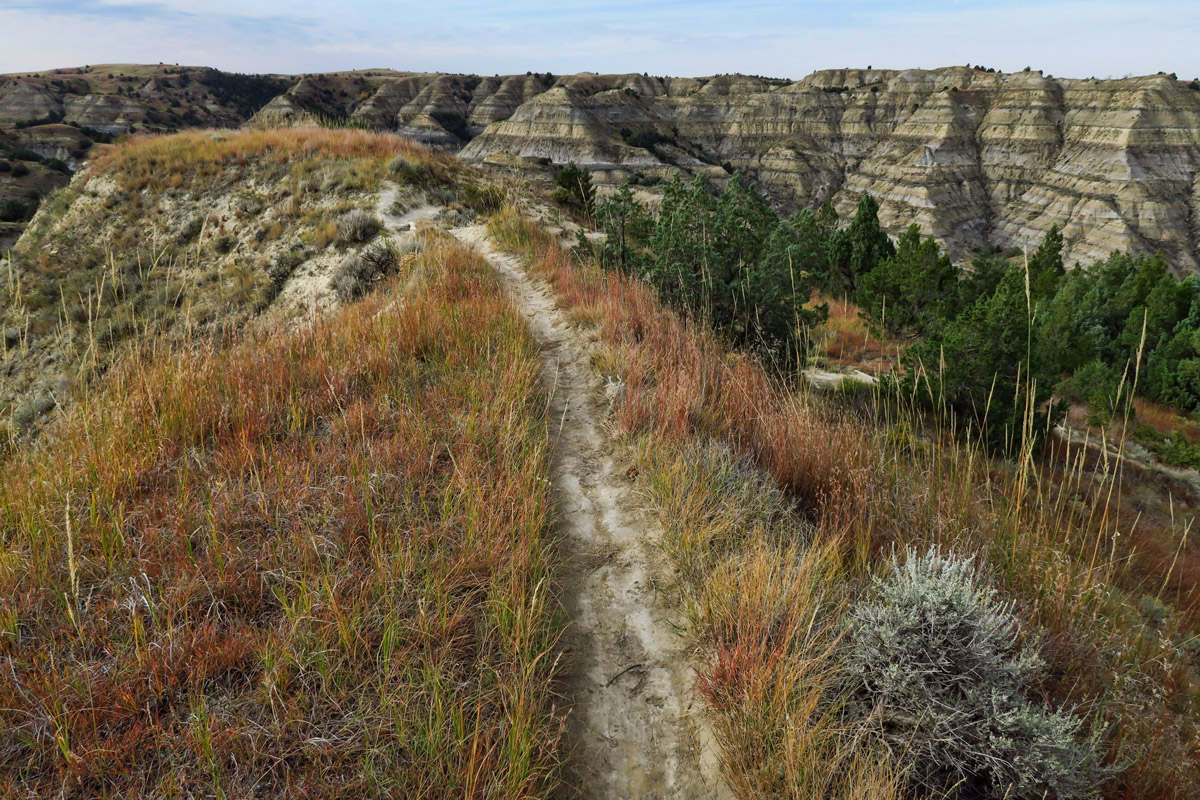 I encountered a hillside slope of bentonite clay on the last quarter of the loop hike the day after a rain. I had two choices — backtrack the 3.5 miles I had already hiked, or find a way to cross it. Suffice it to say, I now have a long-lasting souvenir from Theodore Roosevelt National Park’s North Unit permanently embedded in the seams and woven fabric of my breathable boots and every crack and crevice of my hiking pole.