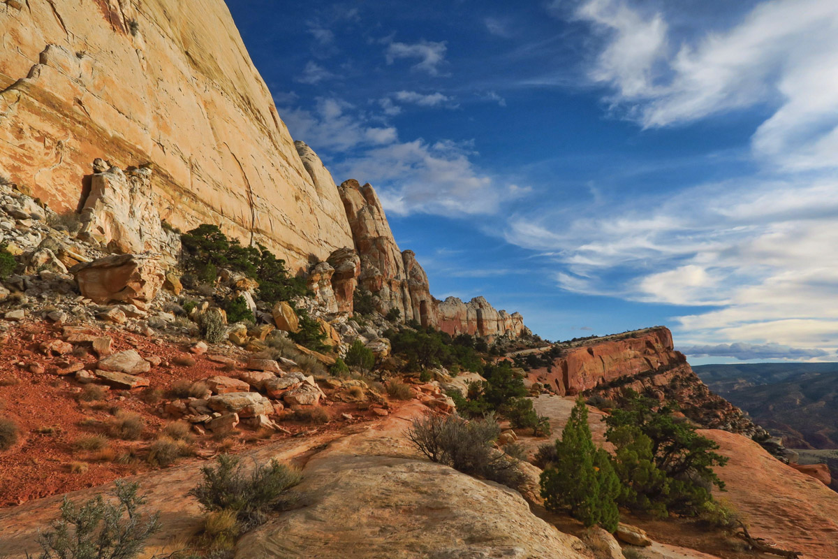 The trail follows the edge of the fold, sometimes right along the ledge, in and out, up, down and around each one of these promontories. The scenery is such a hodge-podge of dentiled cliffs, fluted walls, angular chiseled rocks, rounded mounds of sandstone, and striated waves that it’s visually stimulating for the entire hike and back.