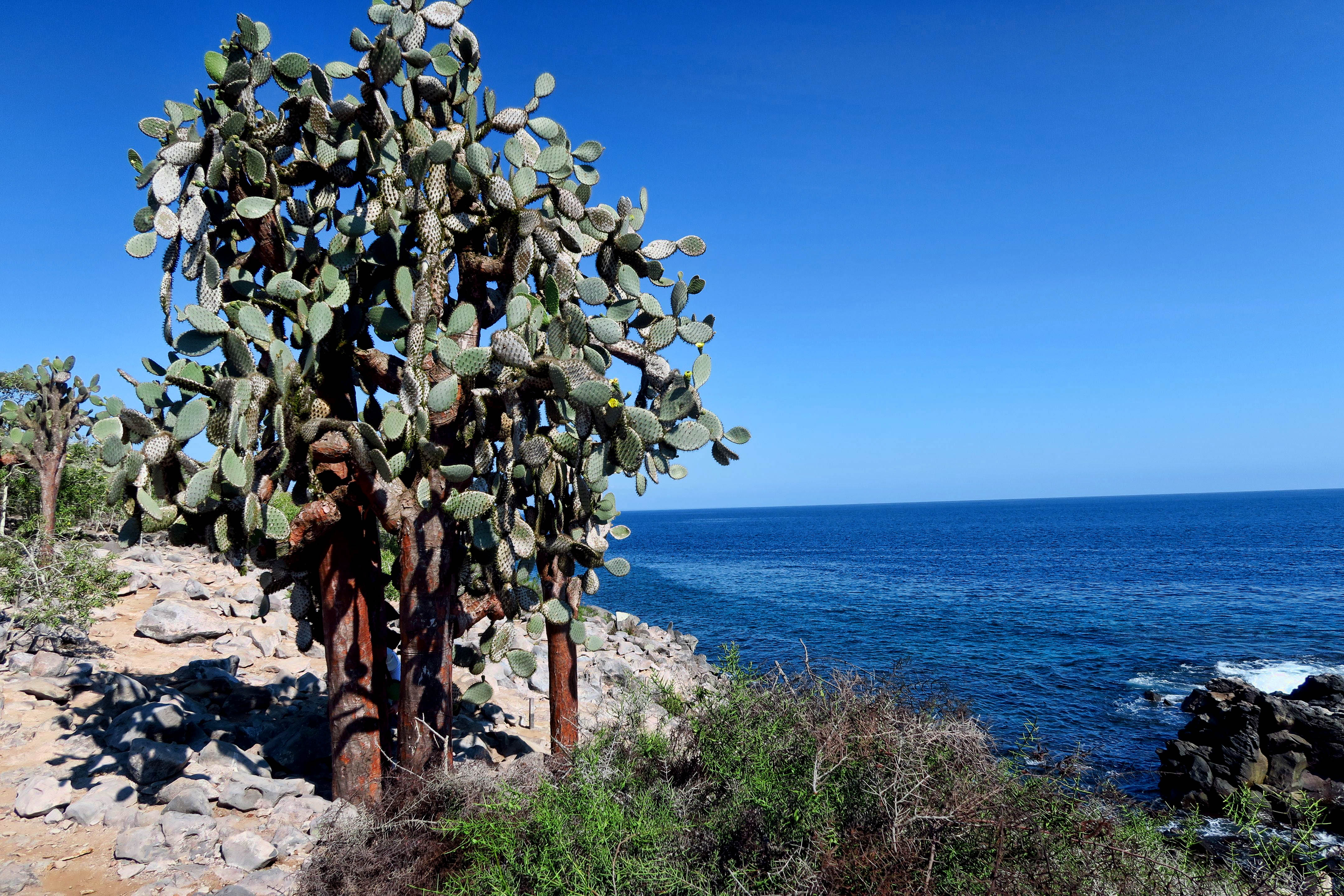But first, we go for a morning hike along the peninsula that surrounds the cove to see some of the largest specimens of the giant Galapagos Opuntia cactus. This particular species of the prickly pear cactus is endemic to the islands, and can grow up to 36 ft, like trees. The cacti are a food source for tortoises, land iguanas, and many birds, particularly the Galapagos finches. It’s a symbiotic relationship necessary for survival whereby the finches eat the cactus flowers, fruits and seeds, and obtain water from pads, and in turn distribute the seeds across the Islands.