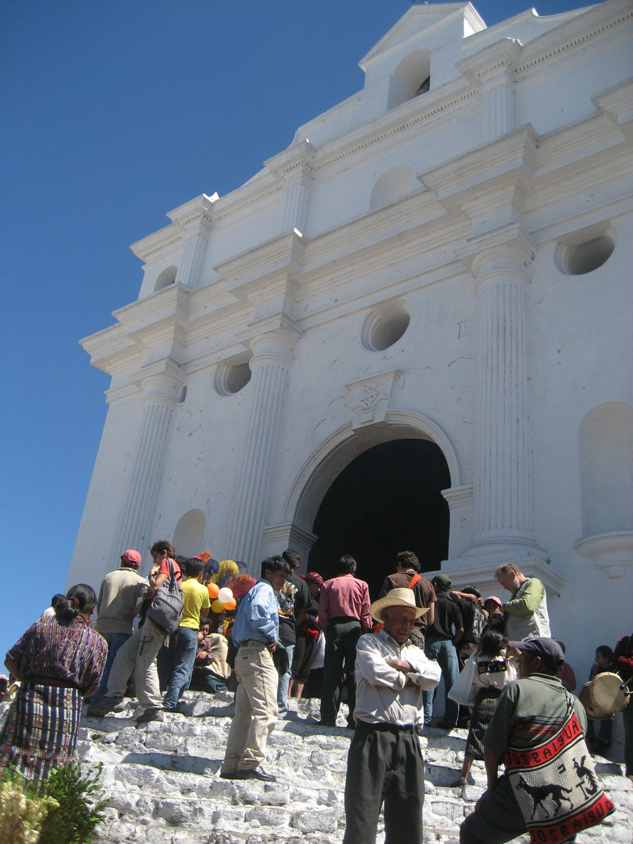 Crowds gather as a Mayan procession approaches on the steps of the 400 year old church, Santo Tomas, built on top of pre-Colombian platform. The steps used to lead up to pre-Hispanic Mayan temple.