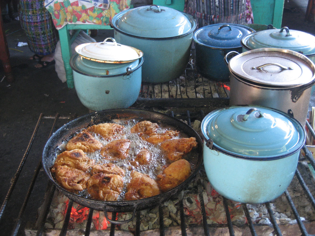 The smell of this chicken frying in boiling oil is making us crazy! Don says, "Think we should have the fried chicken?"