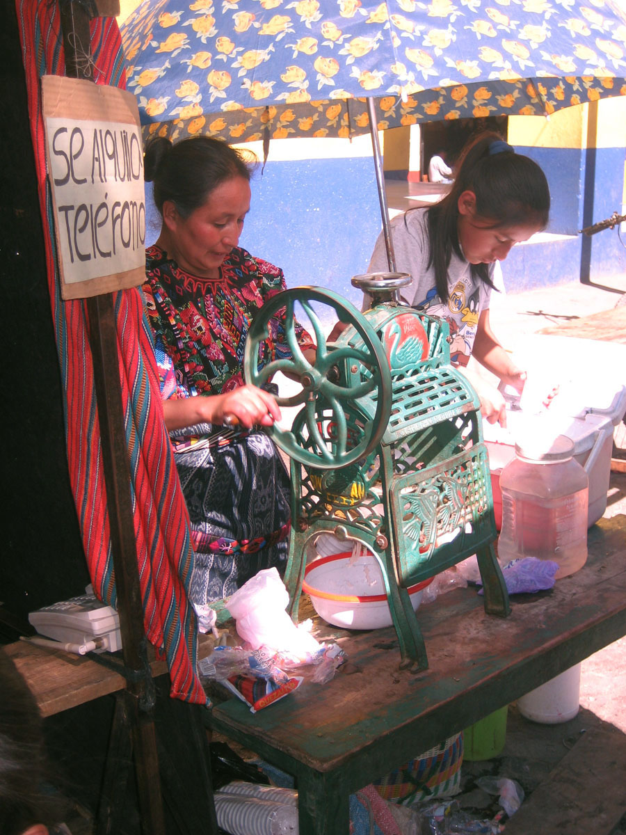 This woman is grinding ice by hand to make snow cones.