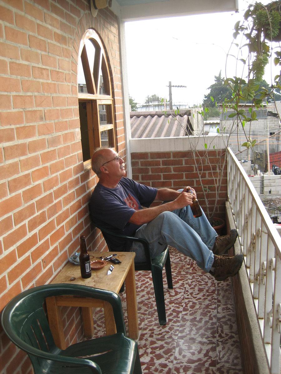 Enjoying a cold beer on the balcony of my cheap but noisy room in Panajachel, Lake Atitlan