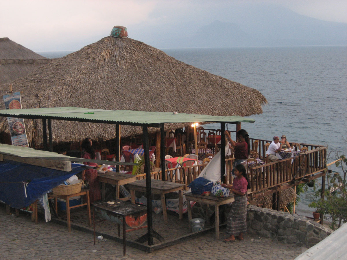 Many outdoor restaurants on stilts over the water along the lake's edge.
