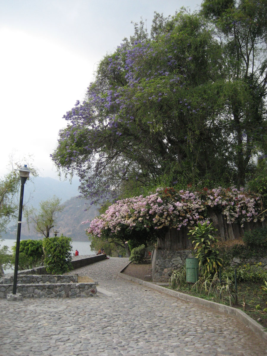 Beautiful park walkway along the lake with pink bouganvilla and purple Jacaranda trees.