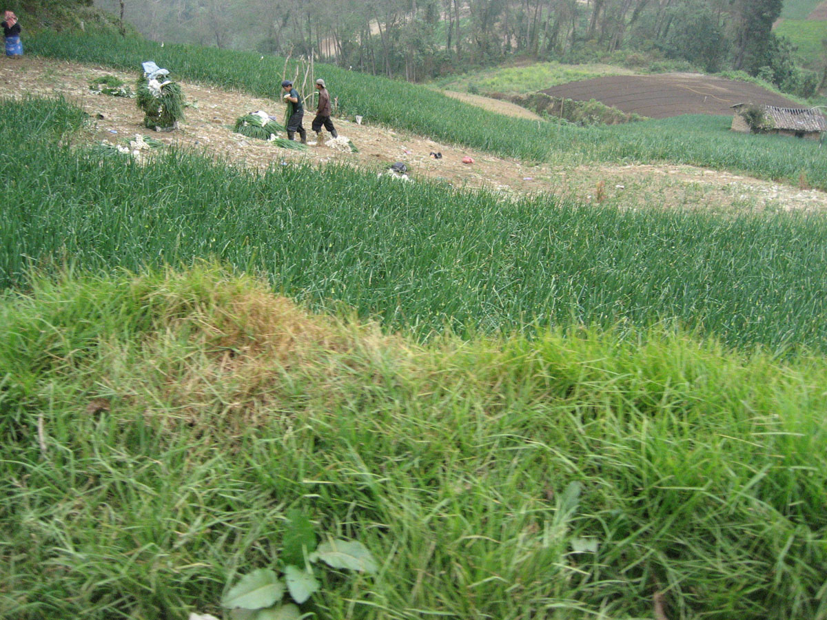 These workers are harvesting onions, which we can smell through the open windows in the shuttle bus to the hot springs.