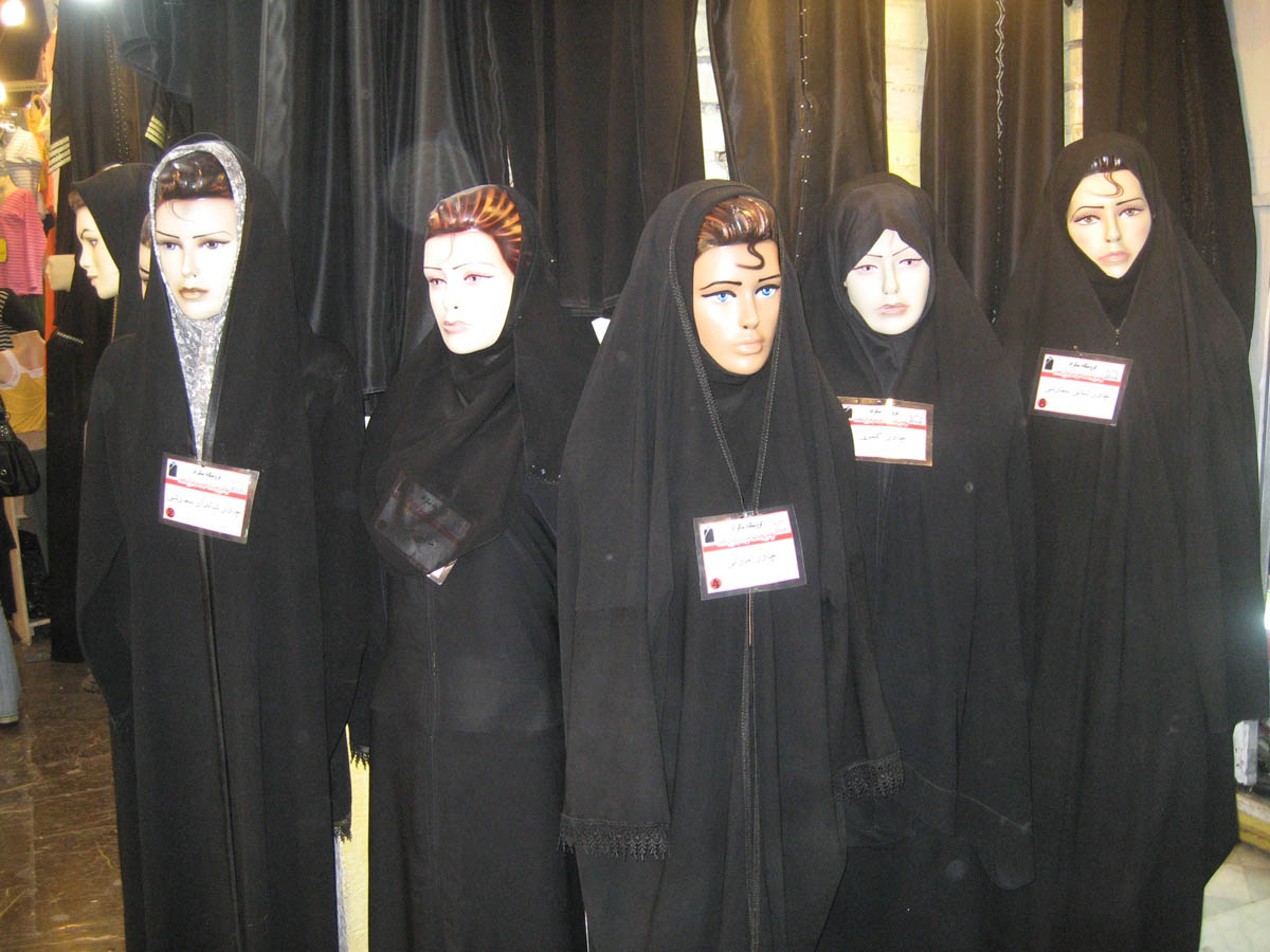 Apparently, a black chador is not just a black chador, as there are many styles and designs to choose from. Since hair should be covered, you gotta love the daring curls on the foreheads.