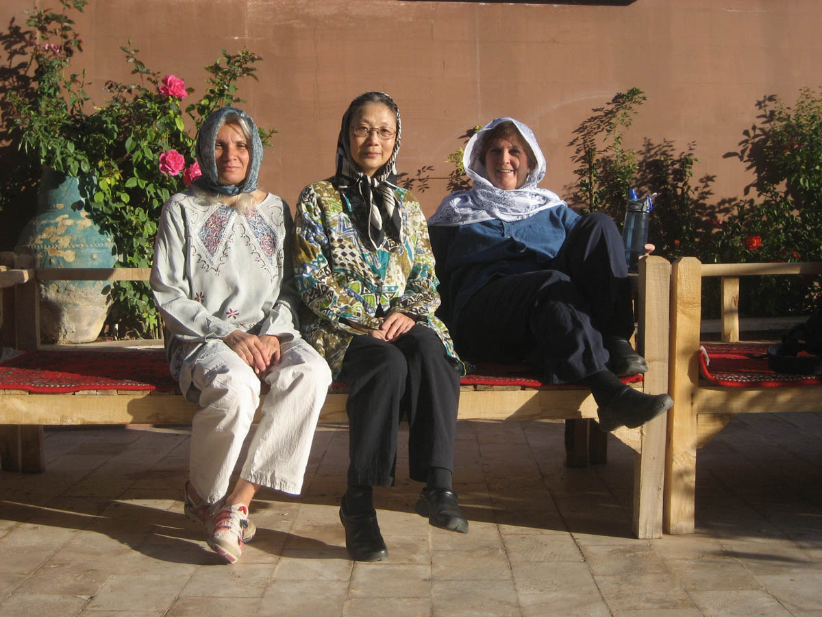 Mariana (Romania,) Coco (New York,) and me enjoying the cool mountain air and the warm morning sun before breakfast in the Abyaneh Hotel courtyard.