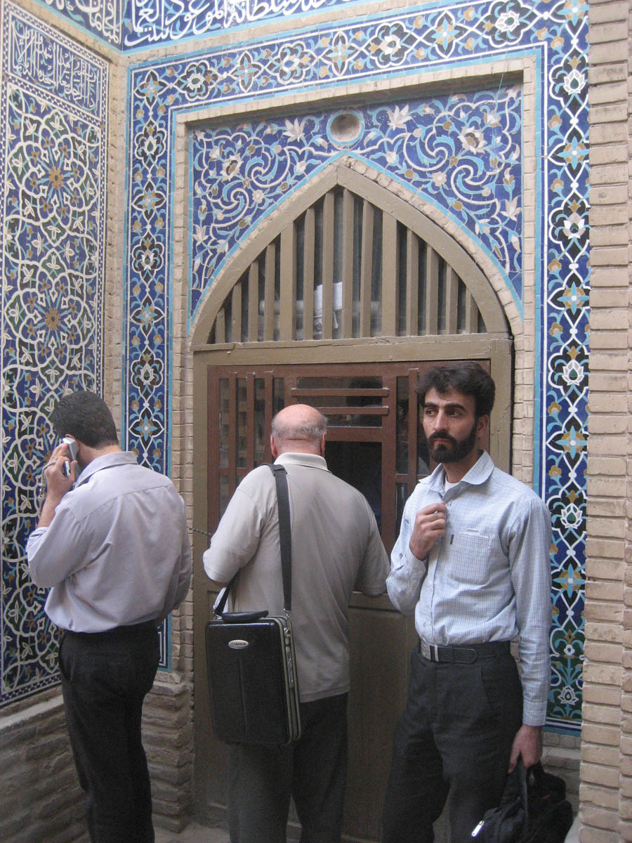 Mr Sakhi, our local Iranian tour guide buys our tickets to enter the Jameh Mosque, Esfahan