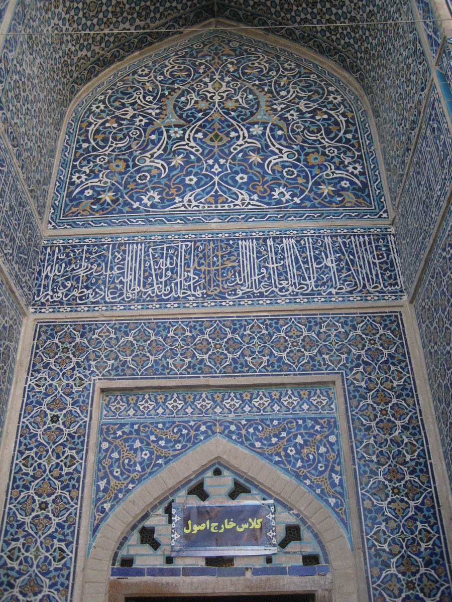 Intricate scripted tiles cover the walls of the Jameh Mosque, Esfahan