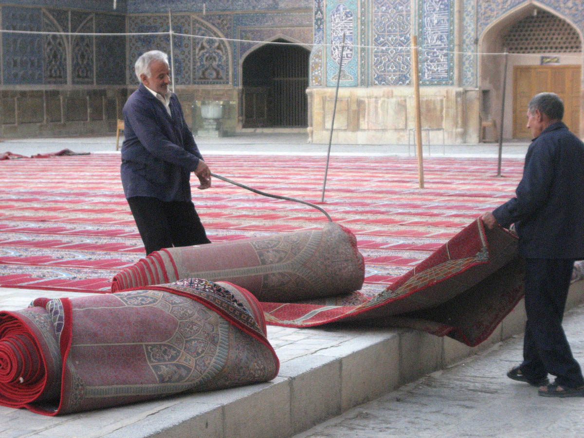 Shi'a Muslims pray three times a day, so these huge bolts of carpets are rolled out at each prayer time, then rolled back up, three times per day.