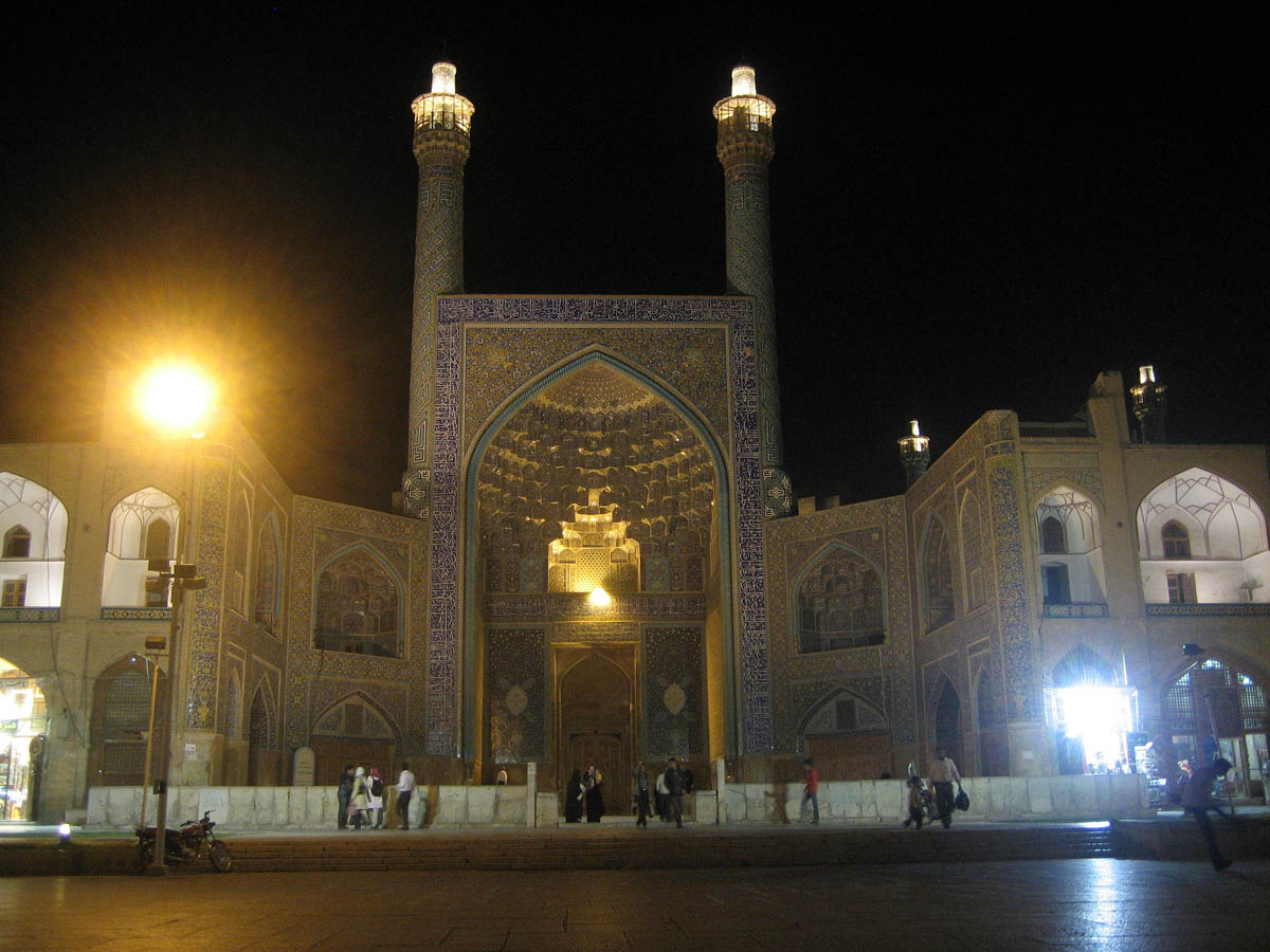 A broader nighttime view of the Imam Mosque, kingpin in Imam Square, Esfahan.