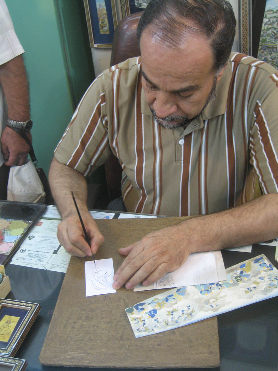 Esfahan is known for it's miniature paintings, so our local guide takes us in for some shopping. The artist sketches out the lined face of a turbaned Imam, and holds it out to the group and asks, "Who would like it?" Lucky for me, I was standing close by!