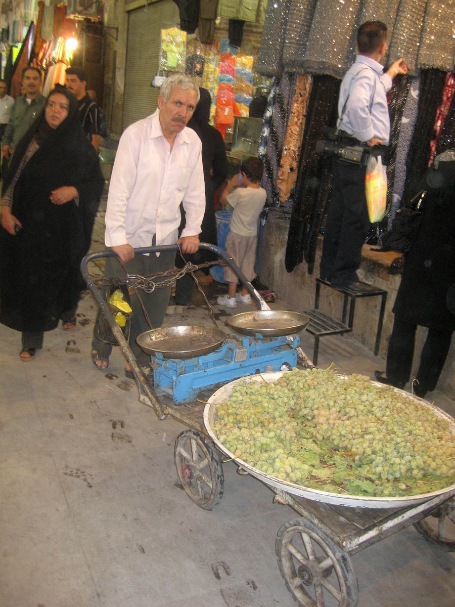 This vendor travels through the bazaar with his weights and his grapes on his pushcart.
