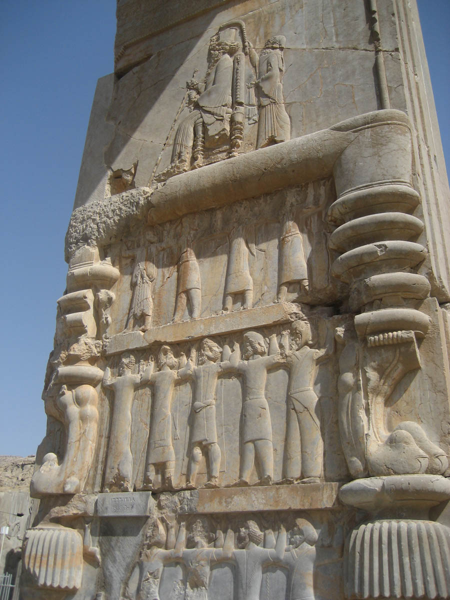 Reliefs on the door jams show a king, soldiers, and representatives of 28 subject nations