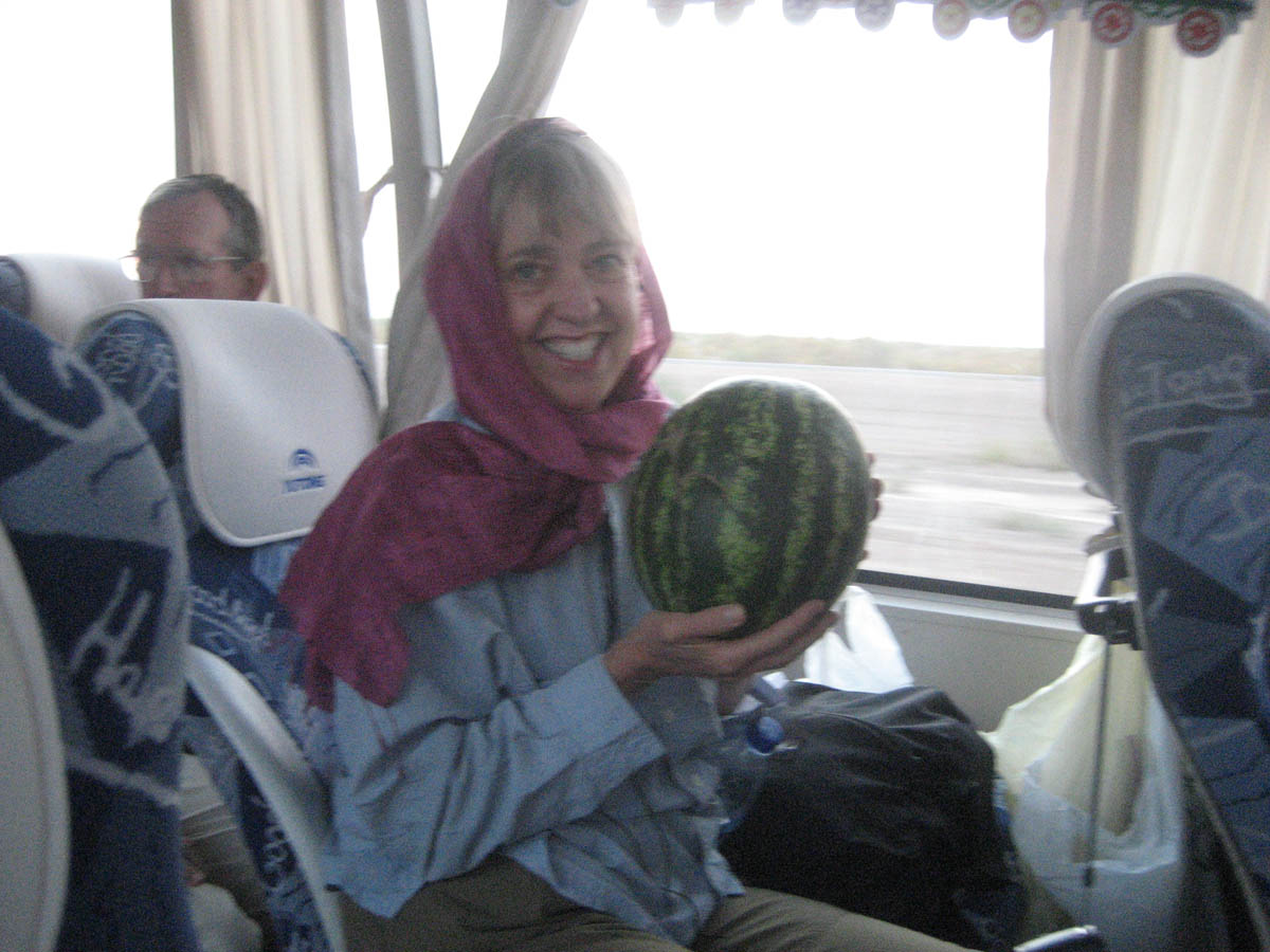 Michele is pleased with her forty cent watermelon purchase. Turns out it has magical powers to attract men willing to carry it under their arm for long distances...