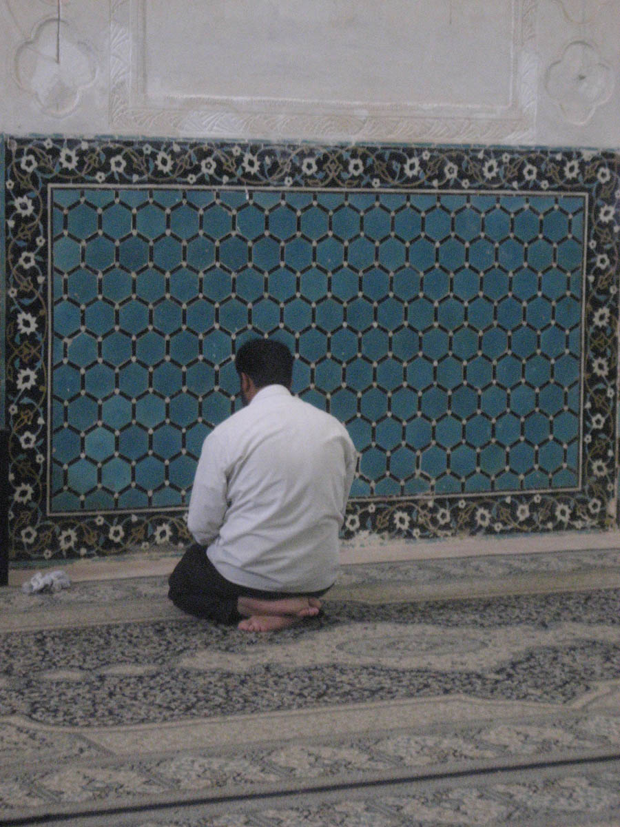 Devotee seeks out a quiet place to pray among the curious tourists.
