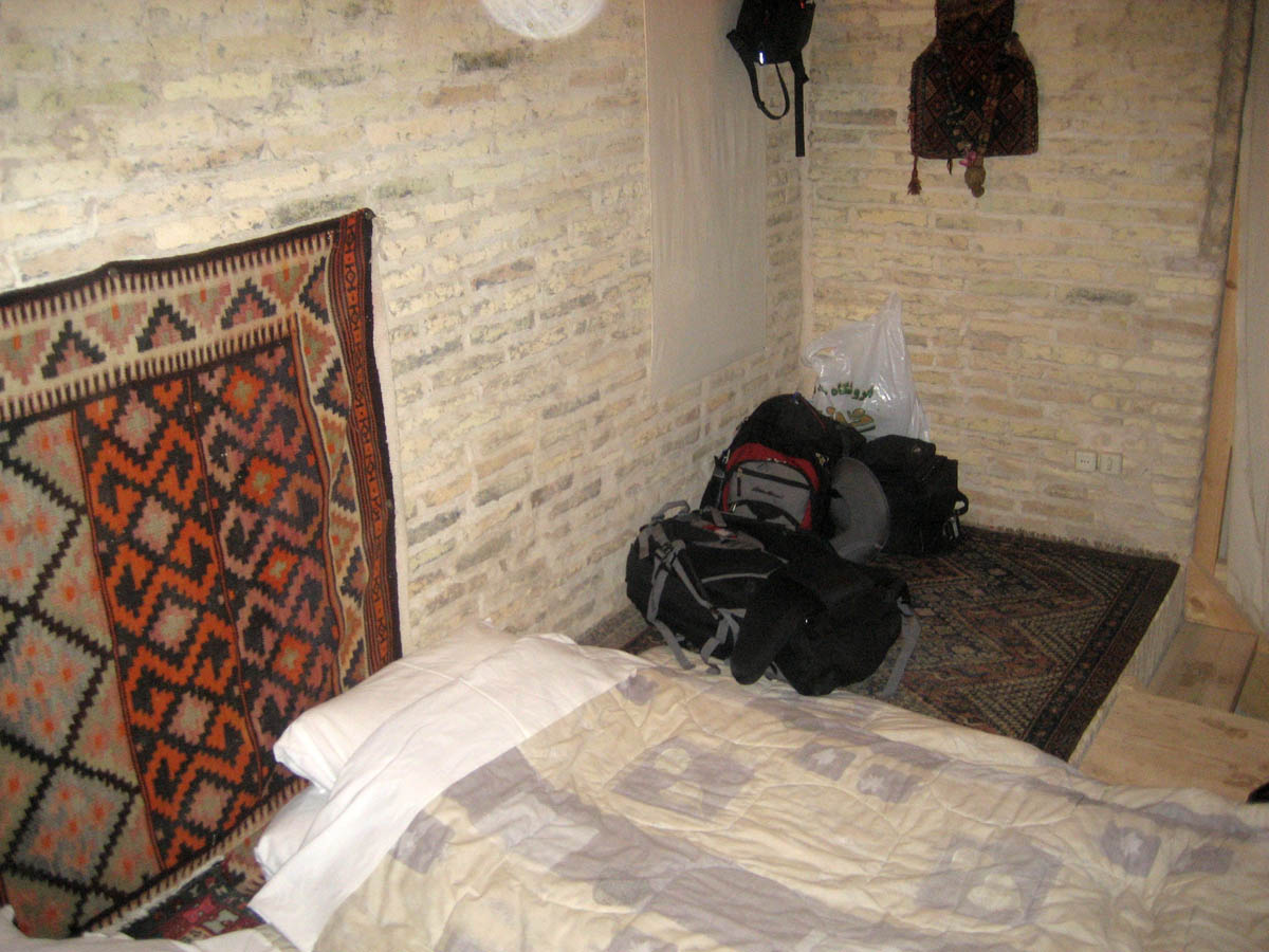 Rooms in the Zein-o-Din caravanserai are nothing more than raised wooden platforms surrounded by canvas curtains. Carpets were headboards, and mattresses on the floor, but all in all, very comfy!