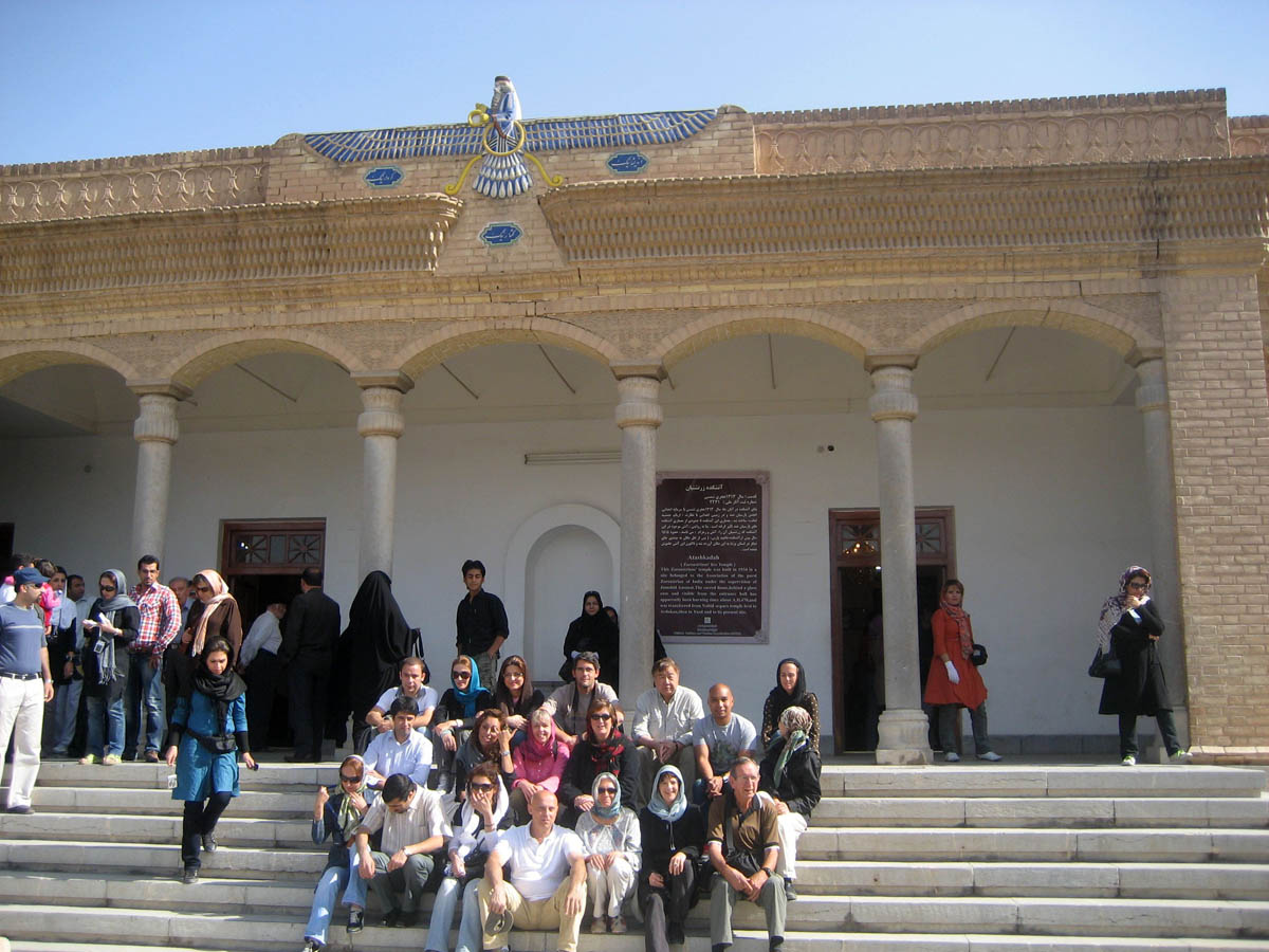 Now in Yazd, our tour visits the Zoroastrian Fire Temple. We go to take a group photo, but another local tour group wants in the picture! (Our group is to the right of pink center)