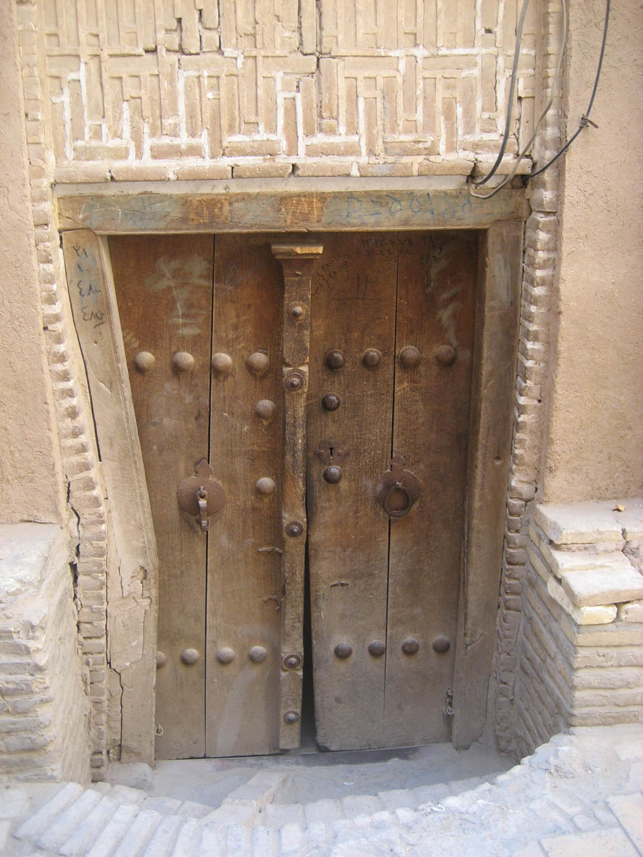 More old weathered, wooden doors in the winding streets of the Old City, Yazd