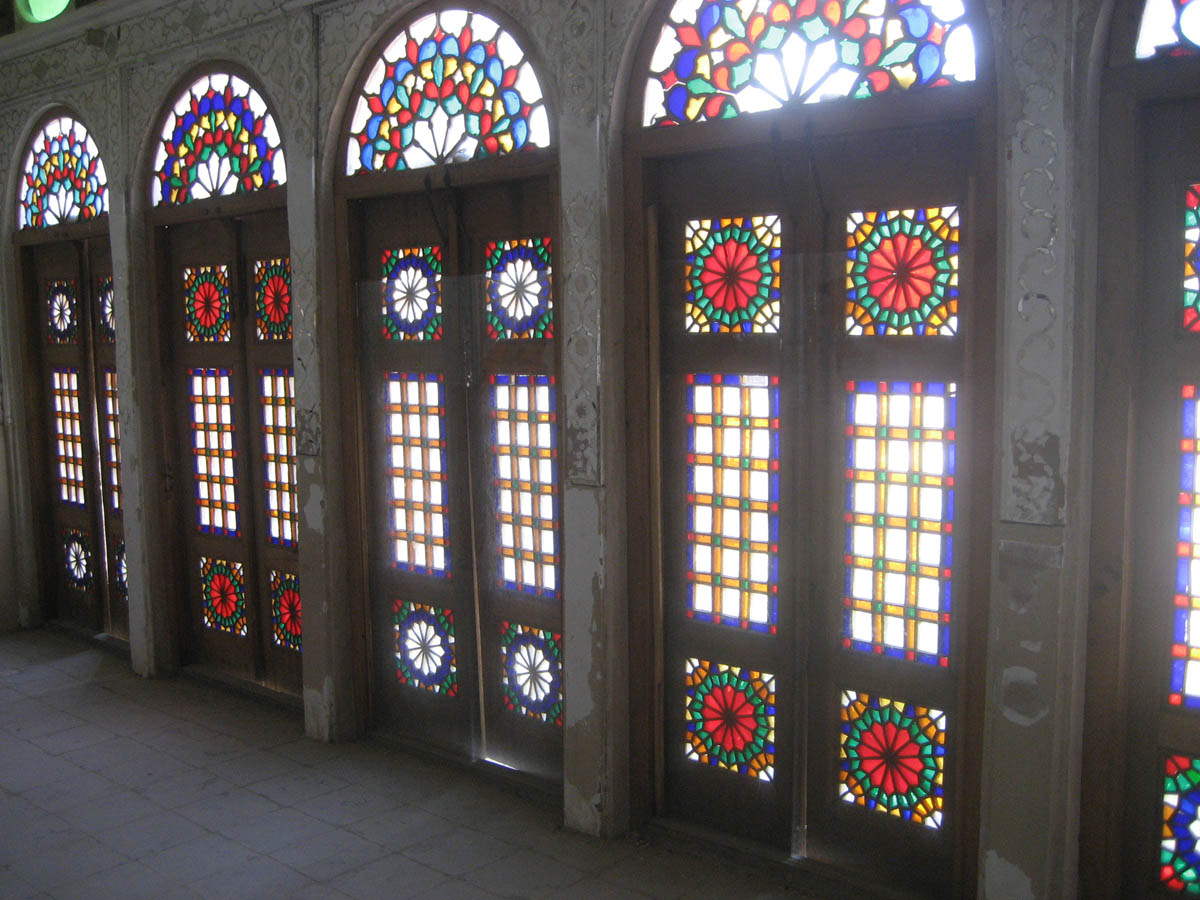 Traditional Iranian homes from the Qajar era have rooms surrounding a courtyard which typically have either three or five doors, often glass or stained glass -- Lariha House, Yazd.